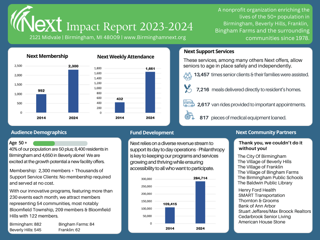 Next has been serving the community for over 47 years! We continue to evolve to meet the diverse interests of today's  residents over the age of 50. We offer a wide variety of life-long learning programs to stimulate your mind, additional art classes to ignite a passion, more fitness to strengthen your body, and so many ways to gather and socialize.